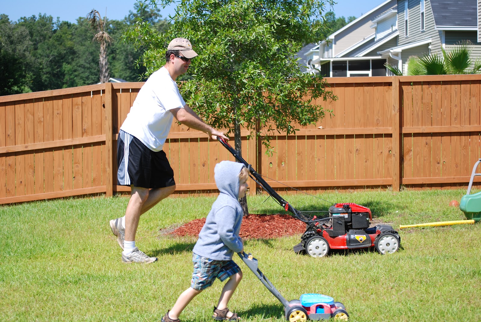 Racing with the lawn mowers (don't worry, Phil's was not on while Avery was this close to him). Sidenote: it was 78 degrees out at the time this picture was taken. Apparently, Avery needed his jacket on.Catching baby frogs in the yard.